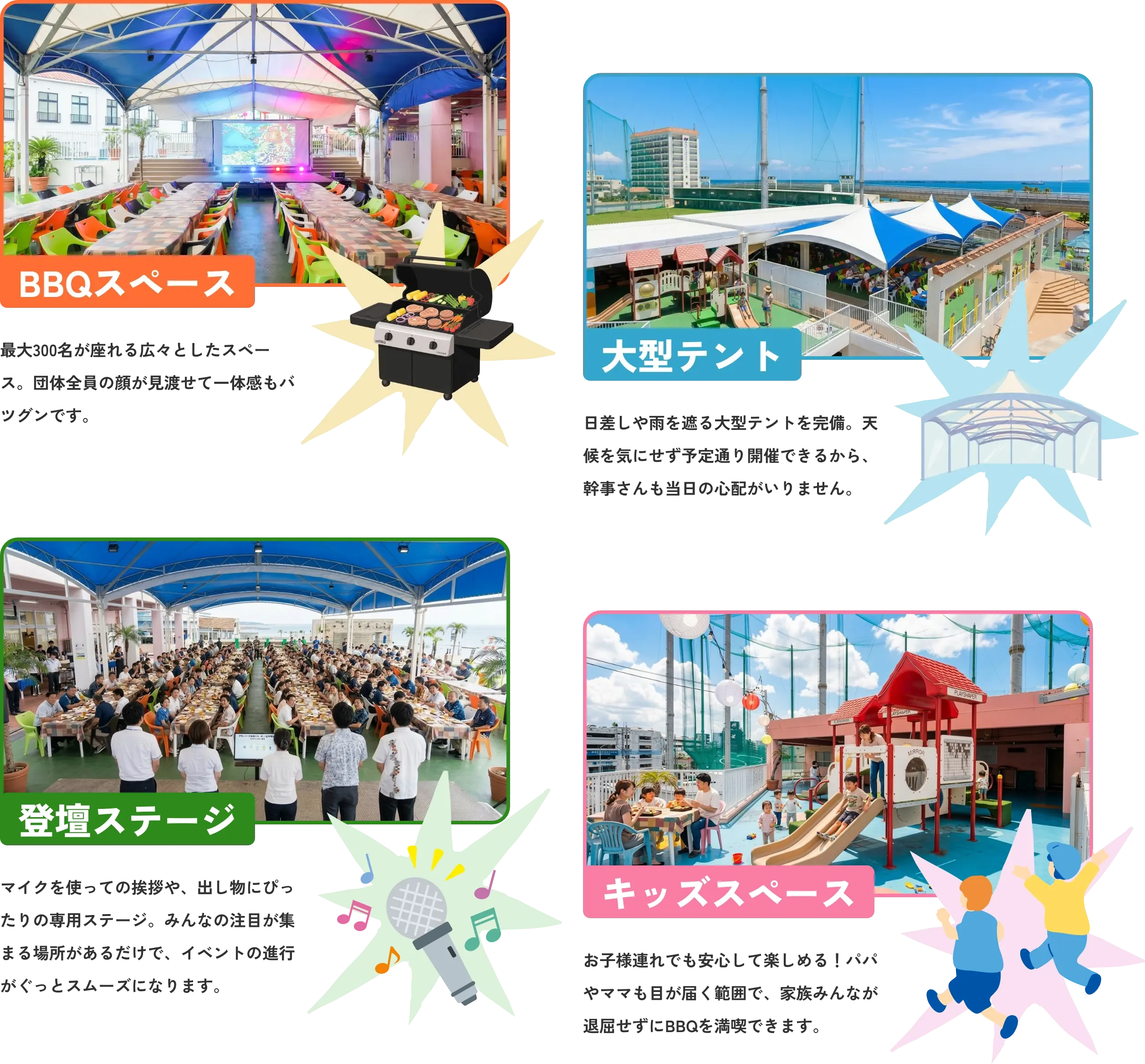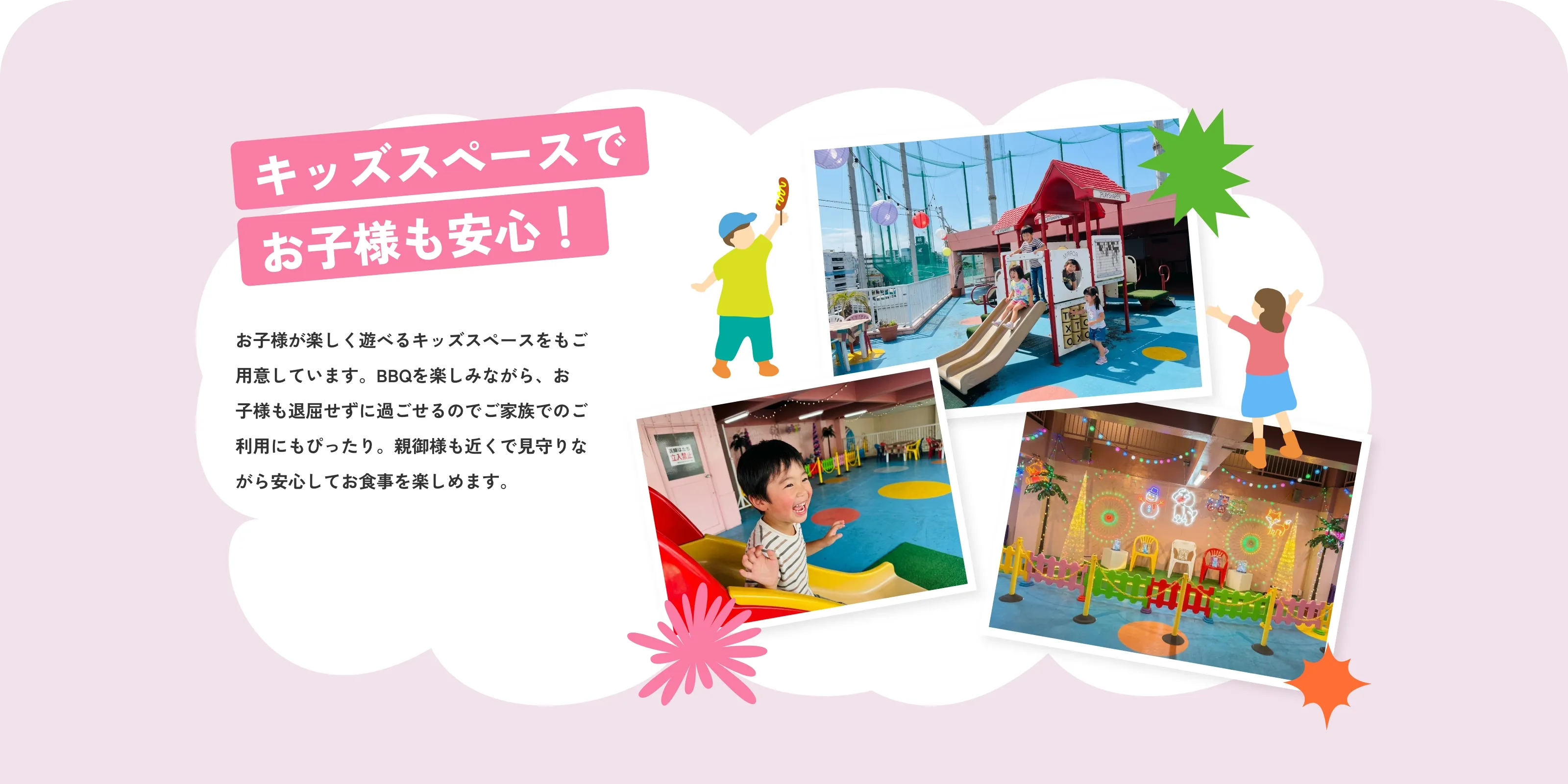 はい、ファミリーでのご利用も大歓迎です。BBQ施設内にはリニューアルされたキッズスペースを完備しており、お客様は無料で使用することができるためお子様も飽きることなく楽しんでいただけます。また施設内に「波の上わくわくキッズランド」もございます。