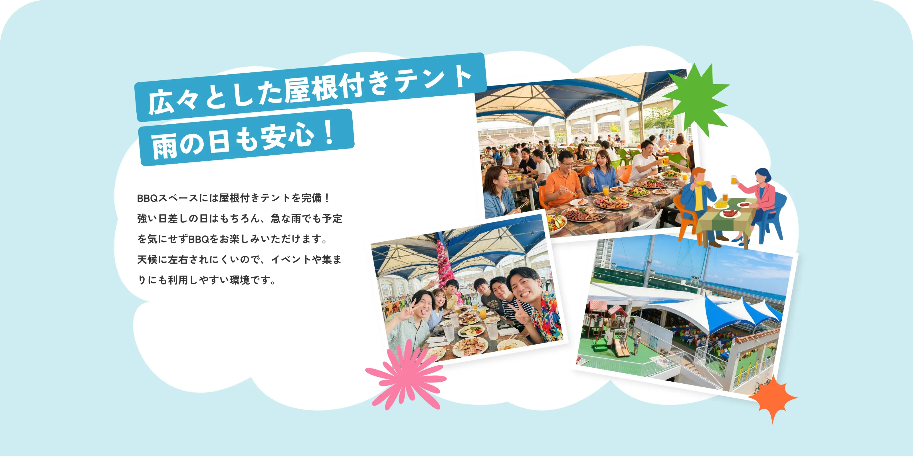 はい、ご安心ください。施設は屋根付きのため雨の日でも問題なくご利用いただけます。また防風カーテンも完備しておりますので、沖縄特有の強風やスコール(かたぶい)でも快適に安心してお過ごしいただけます。