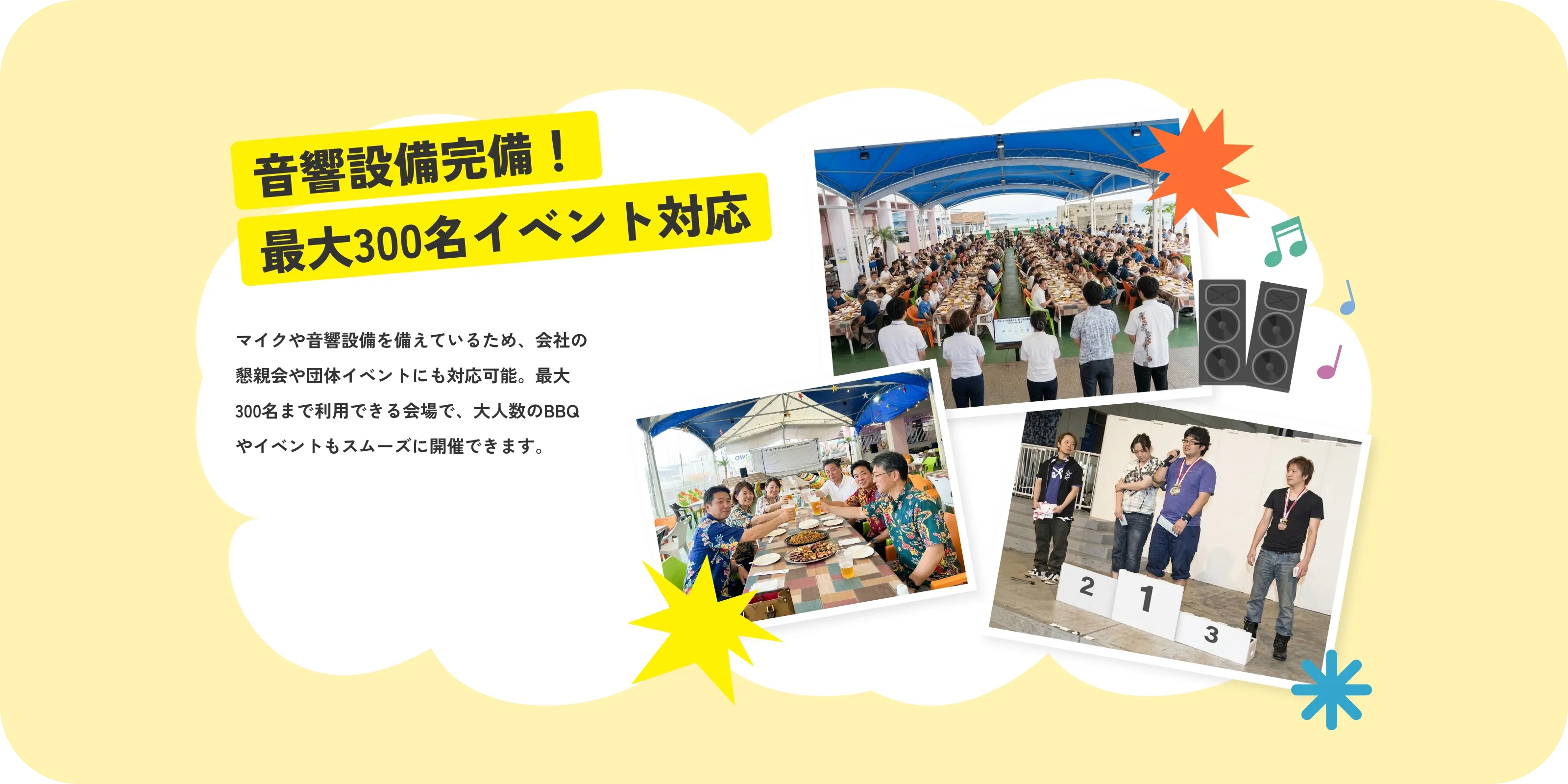 最大300名様までご利用いただける広々とした施設です。350名団体様の使用の実績もあり、会社の宴会や大型イベントなど大人数でのご利用にも対応しております。音響設備やプロジェクターの貸し出しもありますので、MICE(マイス)などのビジネスイベントでの使用も可能です。